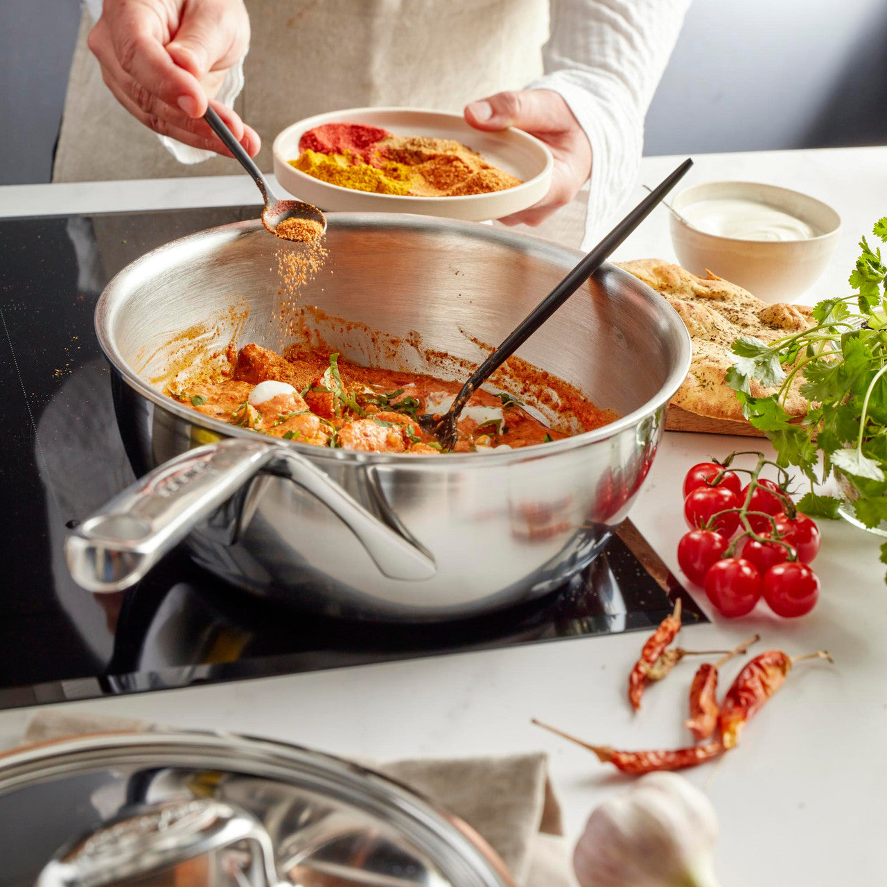 The sloped sides and wide opening of the saucier pans help liquids reduce more quickly, exactly what you need when cooking down sauces and gravies. The perfect-fit lids provide energy-efficient insulation for excellent heat retention. The 7-layer construction of the Atlantis line provides unparalleled frying, perfect browning, and guarantees exceptional heat distribution and retention. Thanks to a unique welding technology, DEMEYERE’s ergonomic, stay-cool handle is extremely secure. And because there are no rivets, it is extremely hygienic. The revolutionary, dishwasher safe Silvinox surface treatment maintains the silvery white finish of stainless steel while making it easy to clean and more resistant to fingerprints, harsh detergents, and strong acidic foods.